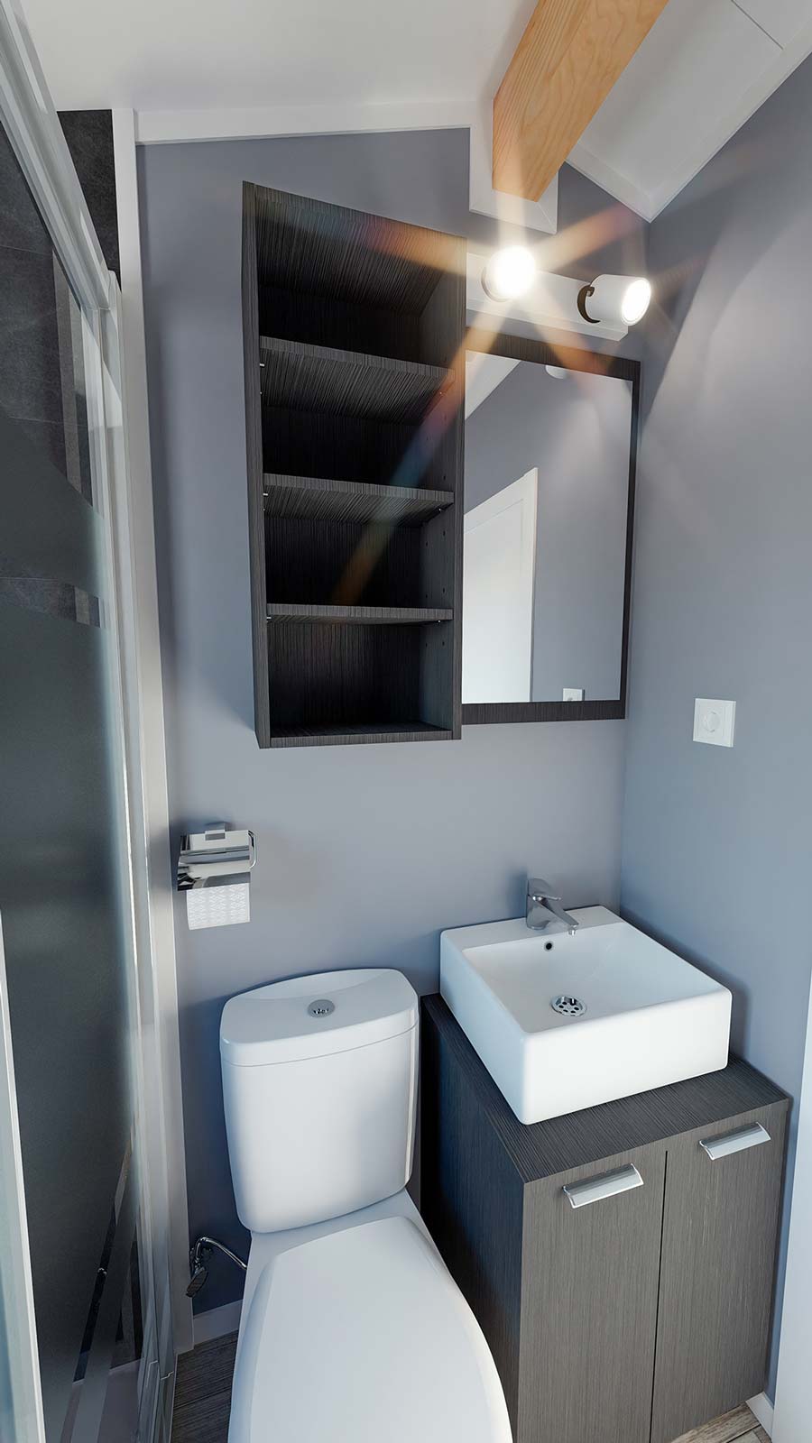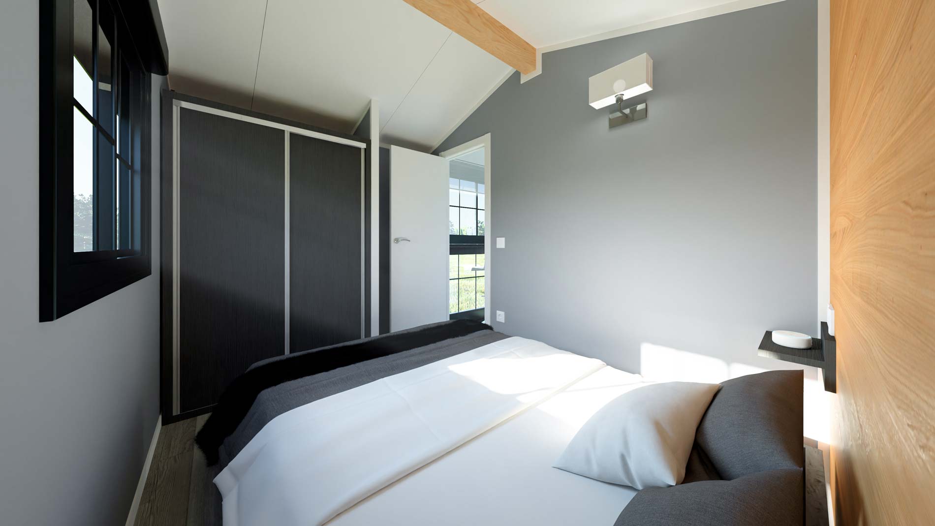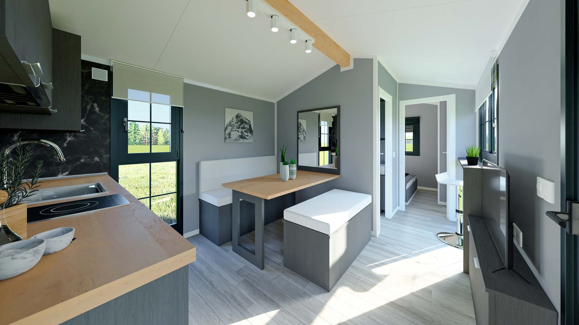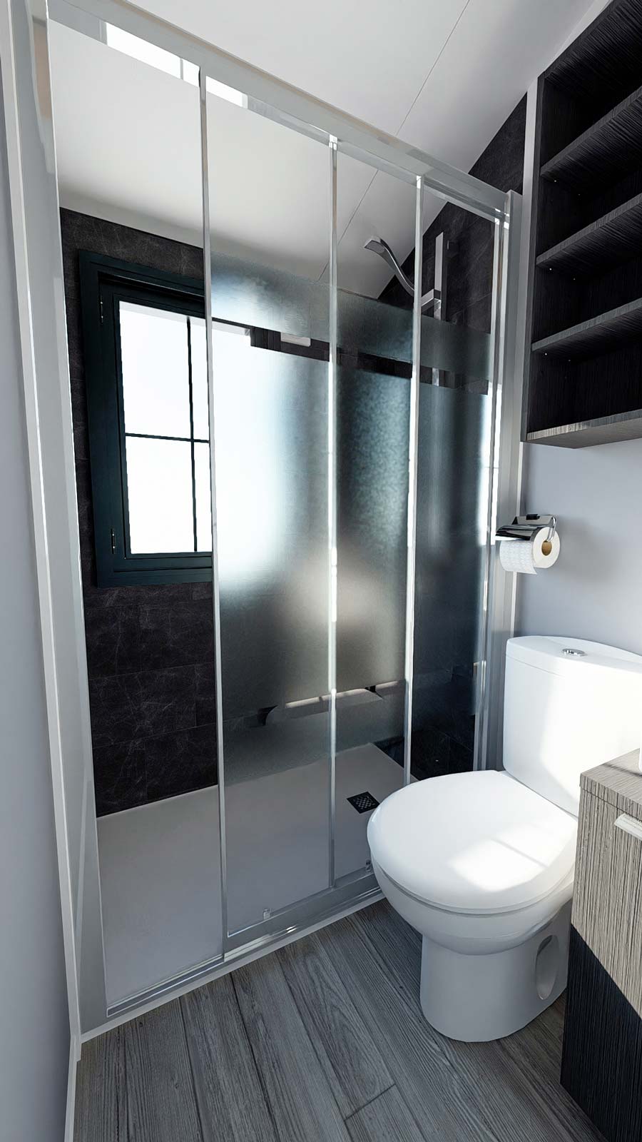 O interior pode ser revestido com diversos materiais, como pavimento laminado, pavimento vinílico, pavimento cerâmico em zonas húmidas, etc.